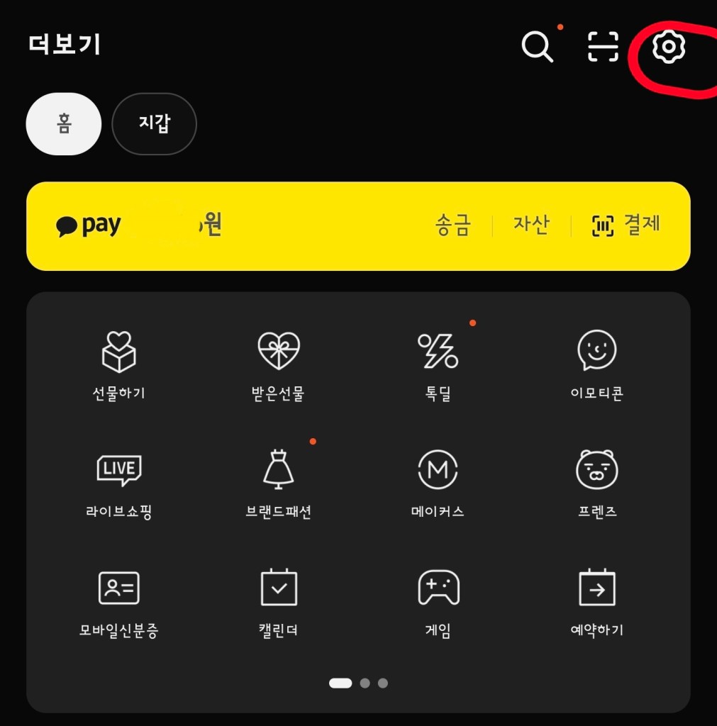 카카오톡을 켜고 하단 [더보기(…)] 탭으로 이동합니다. 우측 상단에 있는 [톱니바퀴(설정)] 아이콘을 눌러주세요.